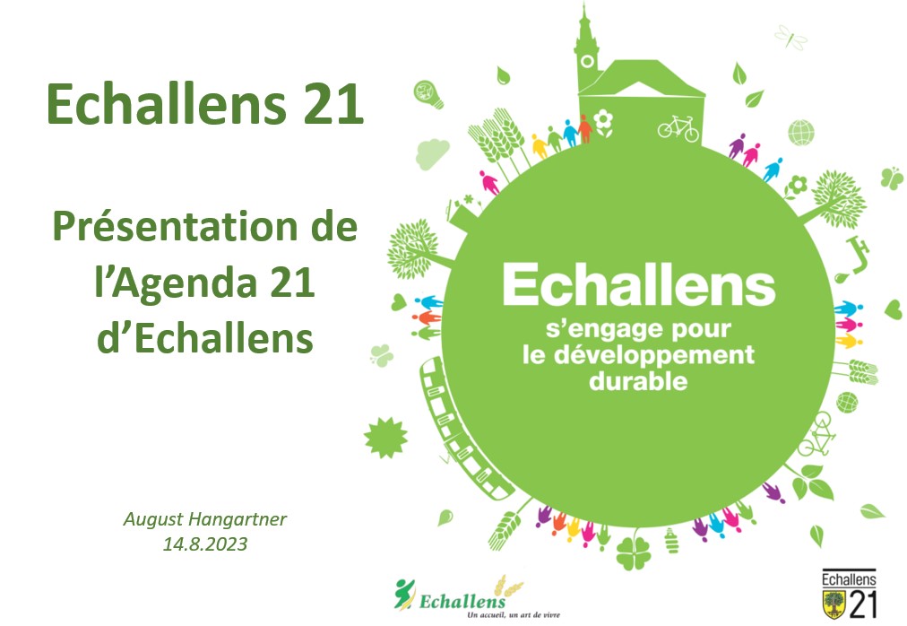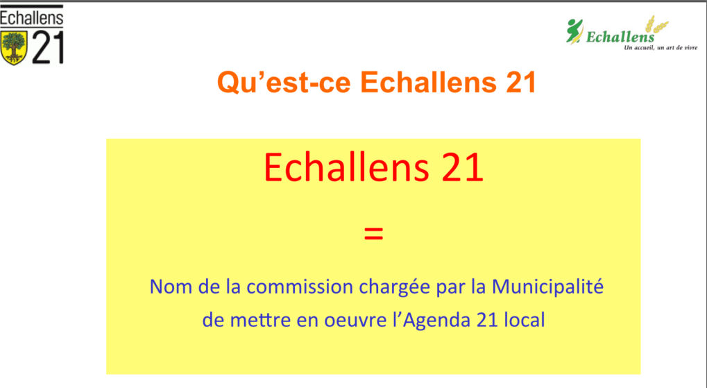 En tant que signataire des engagements d'Aalborg, la commune d'Echallens, par l'intermédiaire de la commission Echallens 21 (E21), a élaboré un plan directeur pour la période 2015-2020. Une communication régulière via des bulletins d'information sera effectuée afin d'informer la population sur l'avancement des travaux réalisés dans ce cadre.