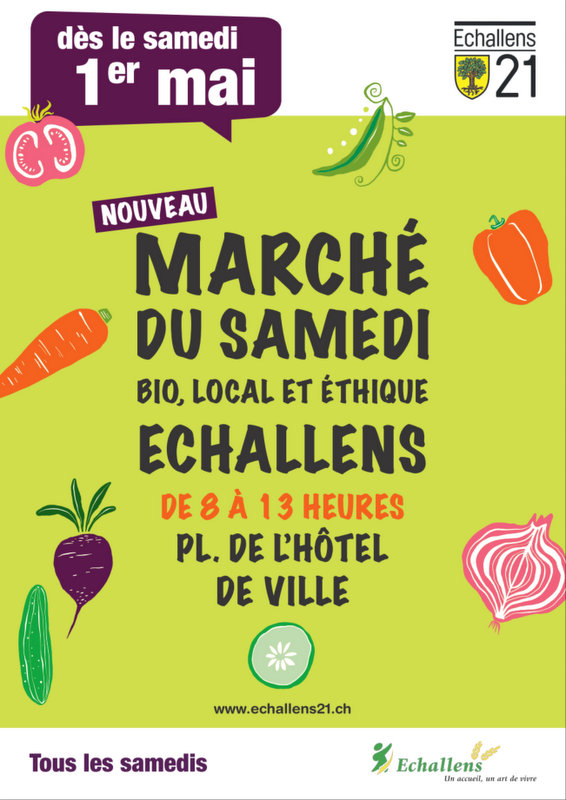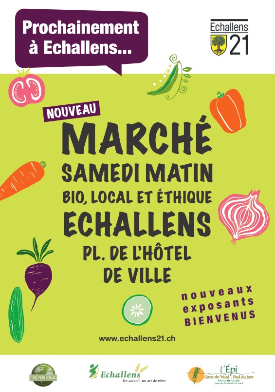 Le projet du futur marché Bio du samedi est en Stand-by actuellement. Les ventes directes à la ferme de notre maraîcher principal ayant littéralement explosé suite à la crise du Covid-19 il renonce pour l’instant à un investissement régulier le samedi matin. Les recherches continuent activement par nos membres pour trouver de nouveaux producteurs motivés. Echallens 21 espère ardemment pouvoir lancer ce nouveau projet à l’automne 2020. Si vous êtes intéressés à faire partie de l’aventure, n’hésitez pas à nous contacter.