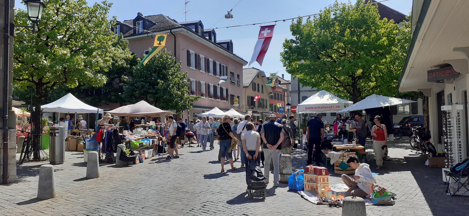 De bon matin et sous un soleil radieux, l’annuel vide-Greniers d’Echallens21 pris ses quartiers sur le parking supérieur de la Place de Court Champ, le château étant encore en chantier.