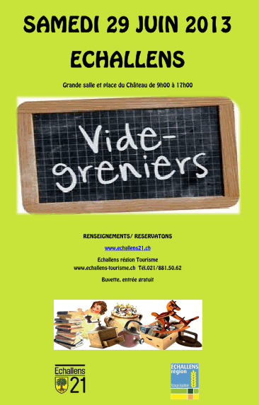 Le 27 juin 2015 aura lieu sur la place du Château le 4 ème vide-grenier d’Echallens. Venez nombreux flâner entre les stands à la découverte de l’objet rare ou même exposer! Les nombreux exposants (près de 80 en 2014) se feront un plaisir de vous accueillir. Une buvette est à disposition pour vous désaltérer ou manger un encas.